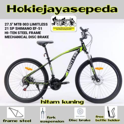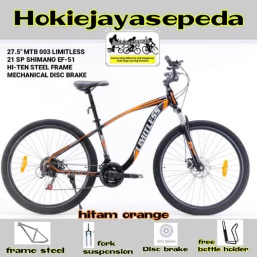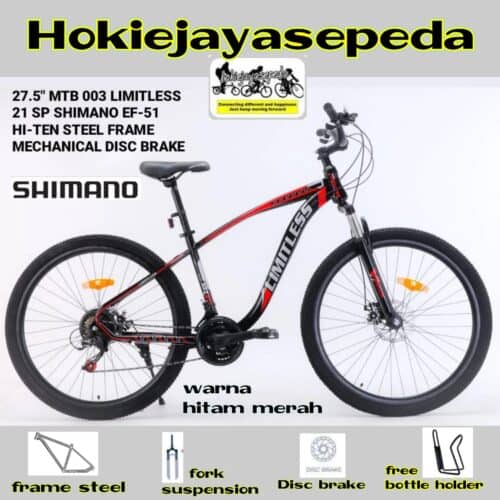 Sepeda Gunung 27,5 Limitless Untuk Segmen Pemula/Low entry akan menjadi teman perjalanan untuk bike to work atau saat berolahraga . MTB ini dilengkapi serangkaian fitur menarik, Frame melengkung yang sporty dan Rem cakram, fork suspensi dan operan 3 x7 speed. Dengan harga ekonomis anda bisa mendapatkan semua dalam sepeda ini